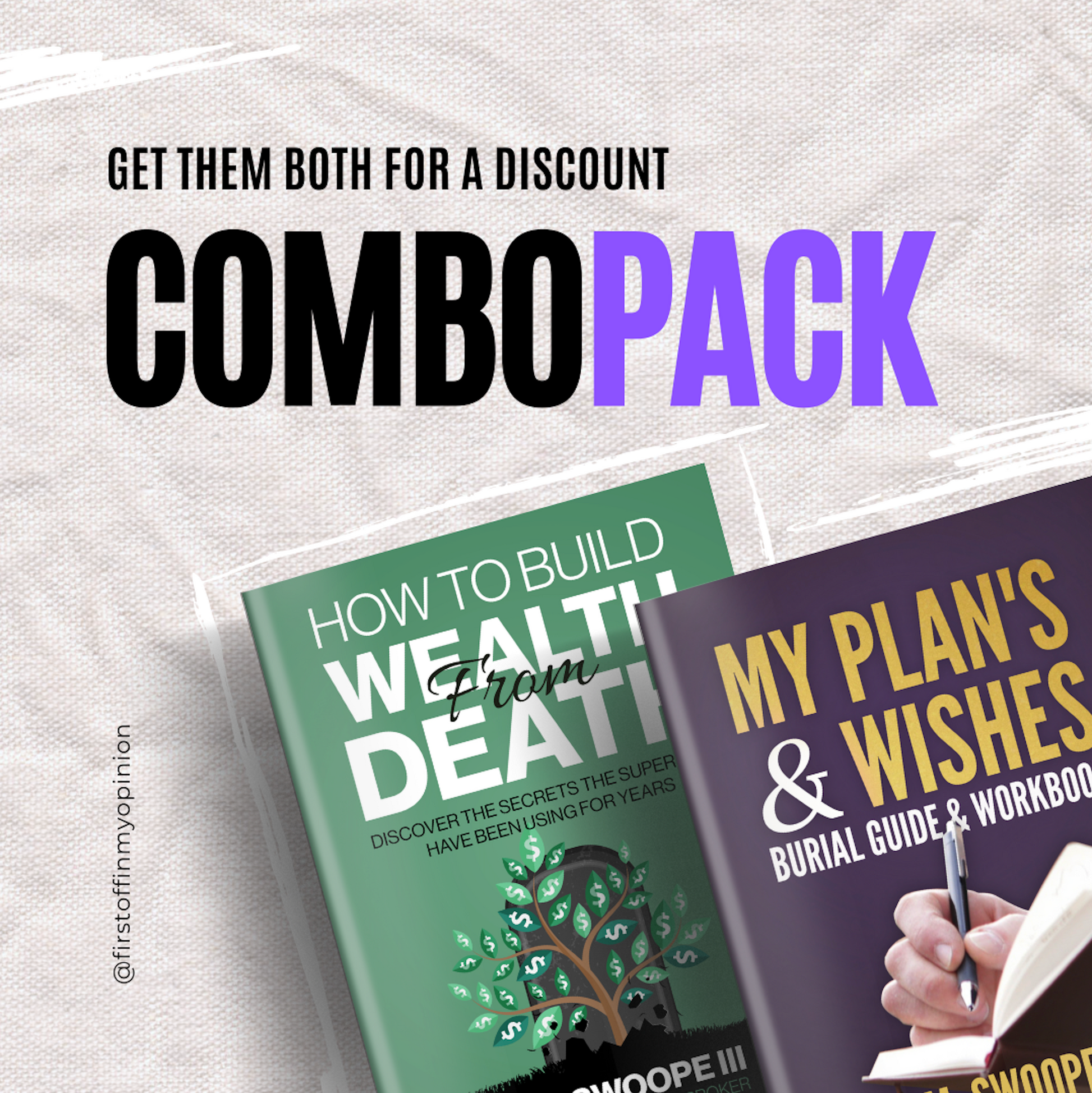 Unlock the full potential of thoughtful planning and financial empowerment with the exclusive combo pack featuring "My Plans & Final Wishes Guide & Workbook" alongside "How To Build Wealth From Death." This unique bundle offers a comprehensive approach to end-of-life planning and financial strategy, authored by the acclaimed Tom Swoope (@firstoffinmyopinion), a licensed insurance broker and viral social media personality known for his expertise and engaging content. Available for a limited time at a deep discount, this digital download combo pack is an invaluable resource for anyone looking to secure their legacy and provide for their loved ones' future.